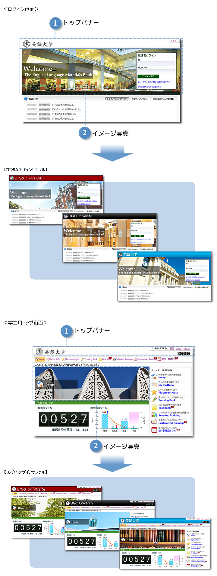 トップバナー、イメージ写真に校章やロゴ、大学のカラー、キャンパスの写真などを利用して、校風にマッチしたオリジナルの