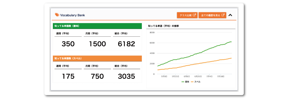 Vocabulary Bankでの学習状況を確認することができます。読める単語・書ける単語数の平均を、週単位、月単位でレポート。結果はグラフでも表示されるので、語彙力の伸びがひと目で分かります。